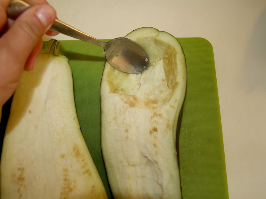 - Partimos las berenjenas por la mitad, longitudinalmente, y con las ayuda de una cucharilla vaciamos la carne y la reservamos.