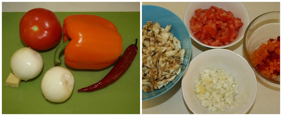 - Ahora pasamos a preparar las verduras del relleno: pimiento, tomate, cebollas, jengibre, chile y la carne de las berenjenas que habíamos reservado. Lo picamos todo finito.