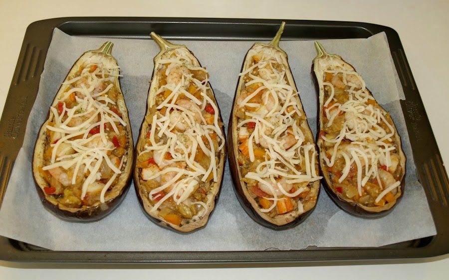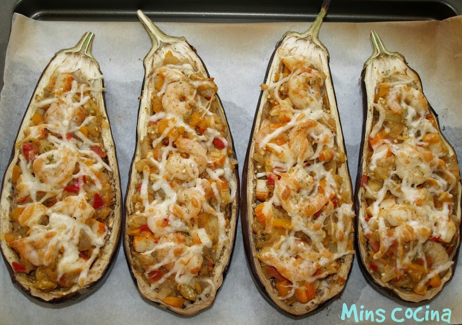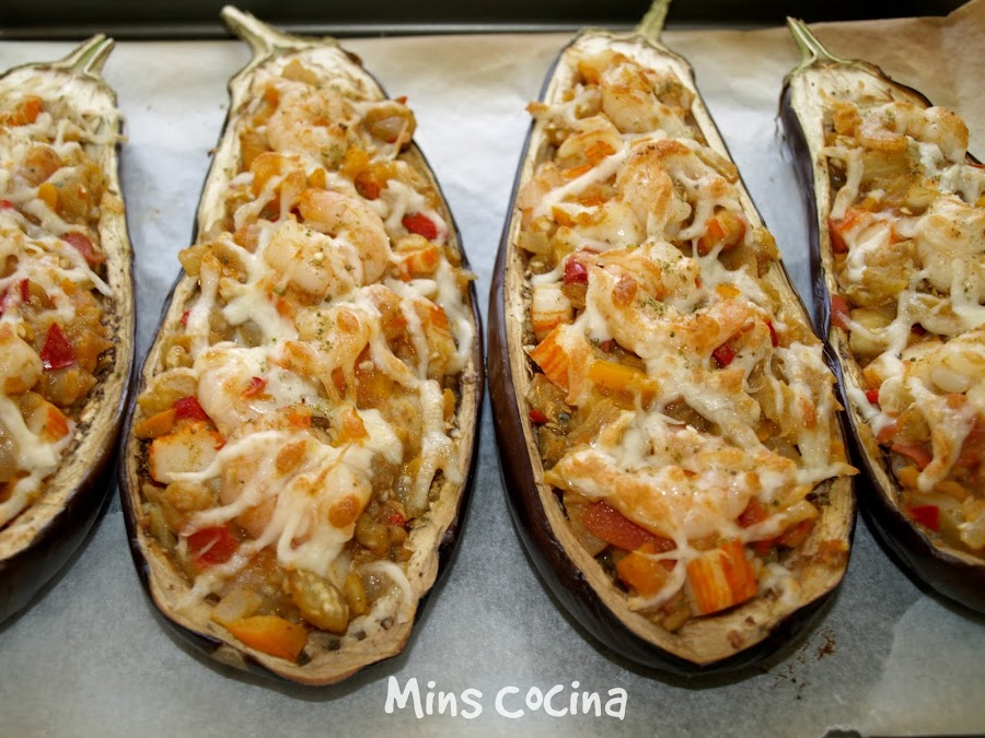 Me apetecía hacer berenjenas rellenas, y me apetecía que fueran más bien ligeras, veraniegas, ahora que por fin empieza hacer mejor tiempo por aquí. Con unas gambas y unos palitos de surimi medio olvidados que tenía en el congelador me inventé un relleno, y el resultado fue un plato exquisito. Ideales para una comida o cena ligeras, como plato principal o entrante. Realmente deliciosas.