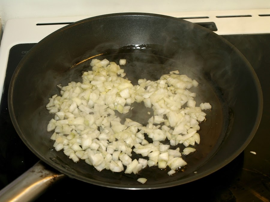 - Una vez preparadas las verduras, el relleno se hace muy rápido. Para ello calentamos un poco de aceite en una sartén y añadimos la cebollas y el jengibre.