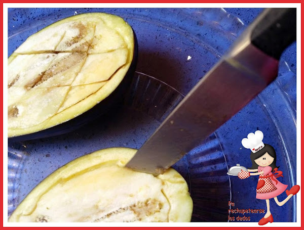 - Con un cuchillo bien afilado, recorta la berenjena por su alrededor, como si fuera un kiwi, y sin llegar a la piel. Esto es para que cuando se cocinen, puedas quitar bien la carne de la berenjena con una cucharilla. Hazle también unos cortes transversales sin llegar a la piel.