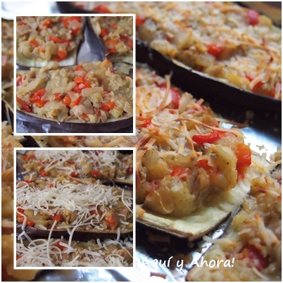 Ponemos a gratinar el horno a 200ºC. Una vez listo el relleno, rellenamos las berenjenas, añadimos por encima el queso rallado e introducimos las berenjenas al horno.