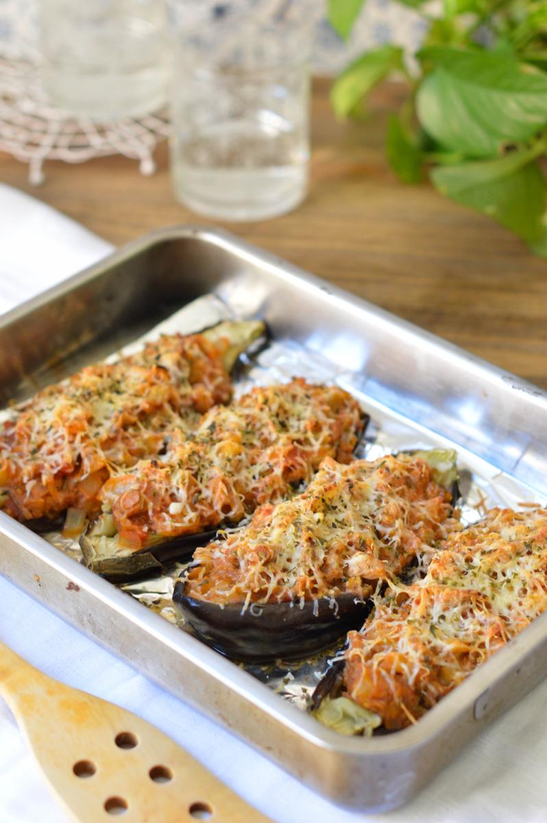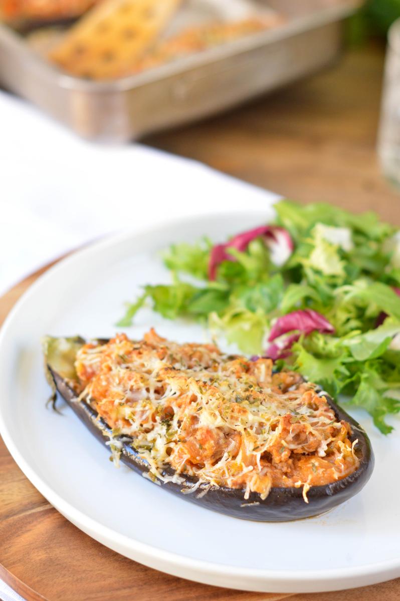 En una bandeja de horno ponemos la piel de las berenjenas que harán como base y las rellenamos bien. Después les rallamos un poco de queso, les ponemos un poco de orégano y al horno uno 15′ a 25oºC para que se calienten y doren un poco.