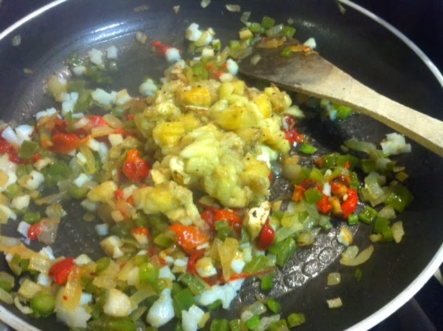 Añadimos la carne que acabamos de sacar de la berenjena a la sarten, el bacalao cortado en daditos y si utilizáis el pimiento rojo en conserva (como lo he hecho yo), añadirlo también a la sartén.