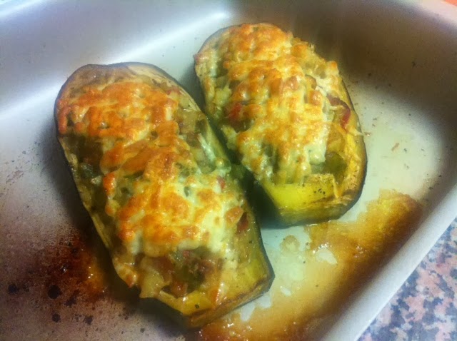 Con ayuda de una cuchara, rellenas el interior de las berenejas, esparcir un poco de queso rayado bajo en grasa por encima y meterlo al horno 10 minutos a gratinar y listas para comer!!!!!!