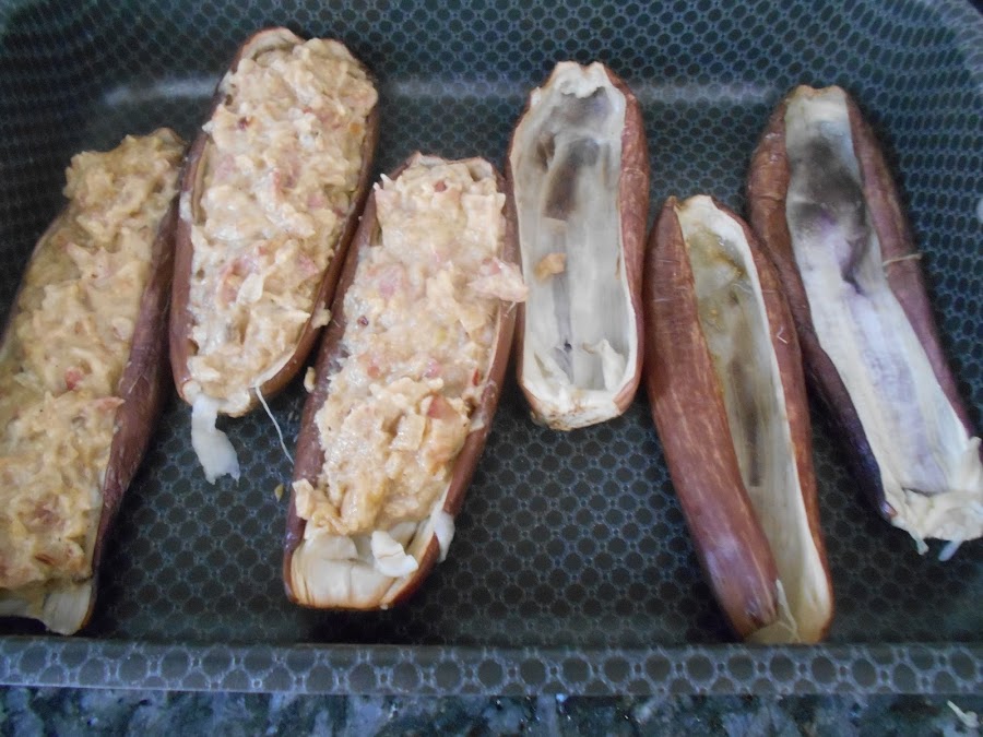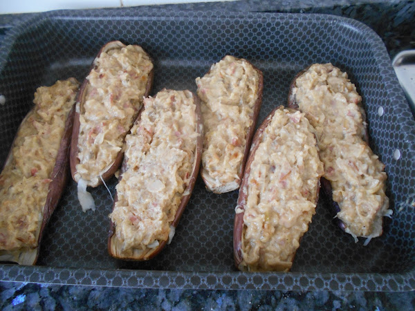 Disponemos las berenjenas en una fuente. Rellenamos las berenjenas. SI OS SOBRA RELLENO NO LO TIREIS QUE OS DARE OTRA RECETA PARA APROVECHARLO