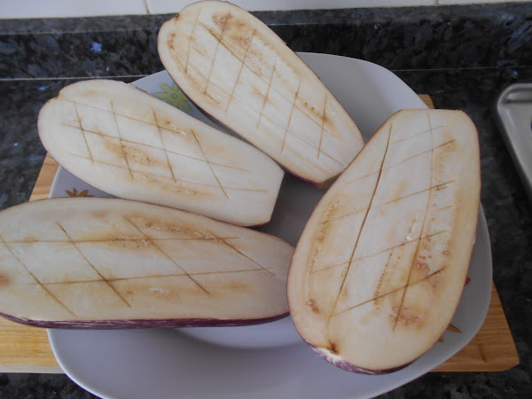 Cortamos las berenjenas en 2 mitades y hacemos unos cortes.