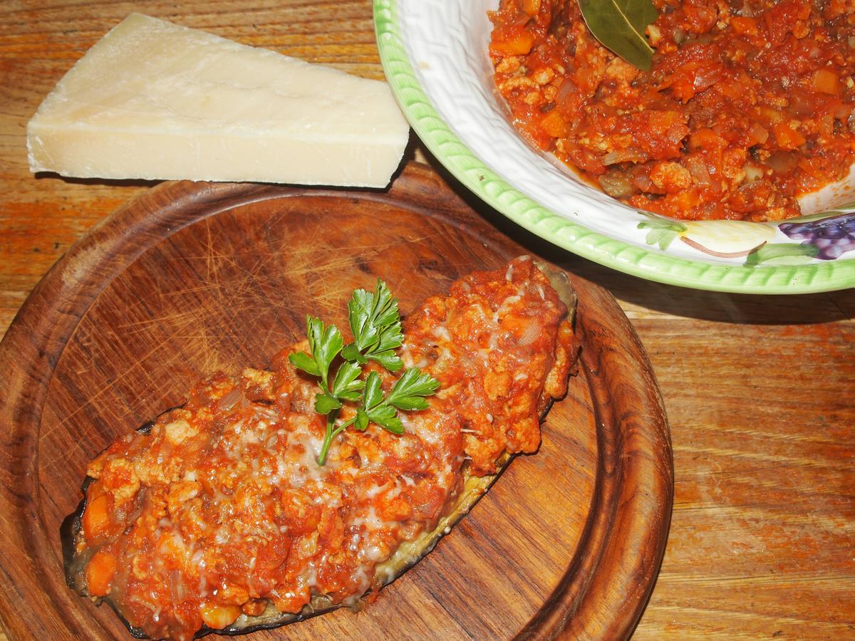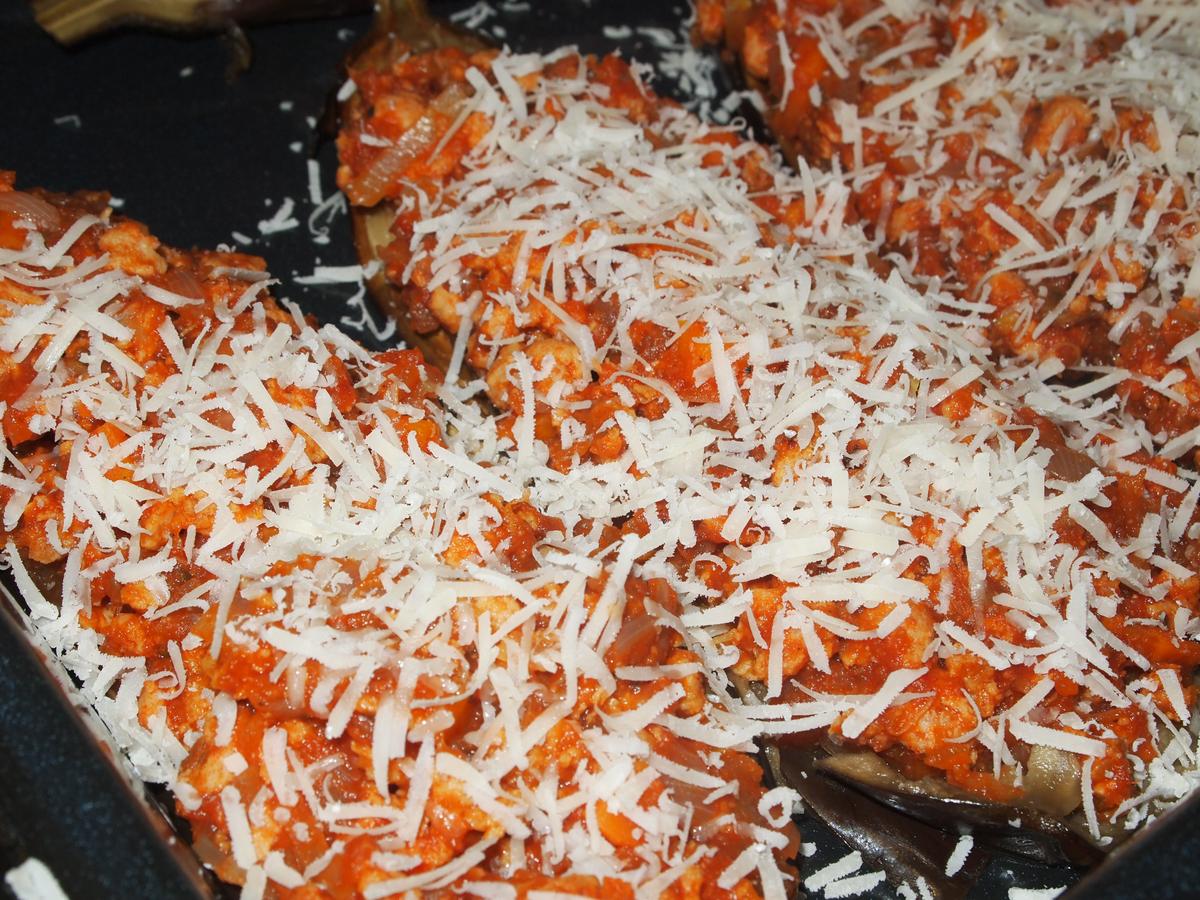 Cuando nuestra “boloñesa” esté lista, rellenamos las berenjenas con ella, espolvoreamos con queso rallado y gratinamos unos minutos.