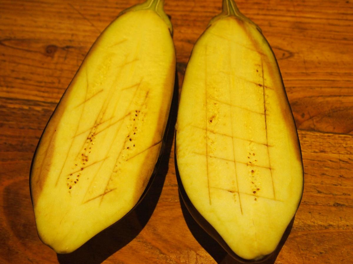 Cortar las berenjenas por la mitad, hacerles cortes diagonales sin cortarlas del todo
