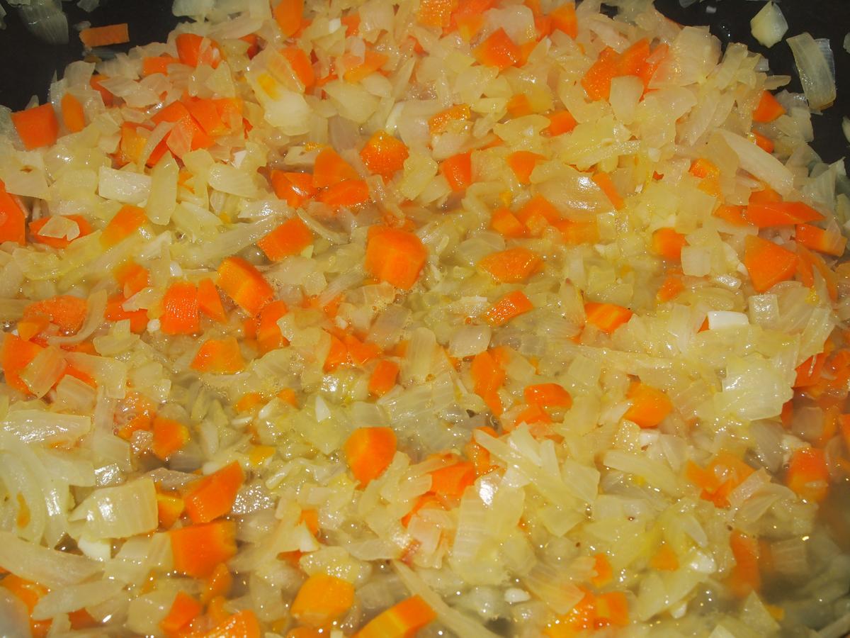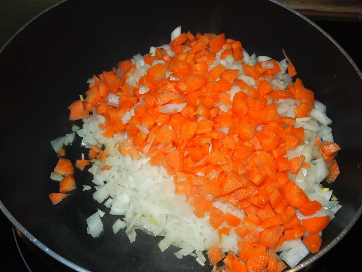 Picamos la cebolla, la zanahoria y el ajo y los rehogamos en una sartén amplia, hasta que la cebolla se dore y la zanahoria este blandita.