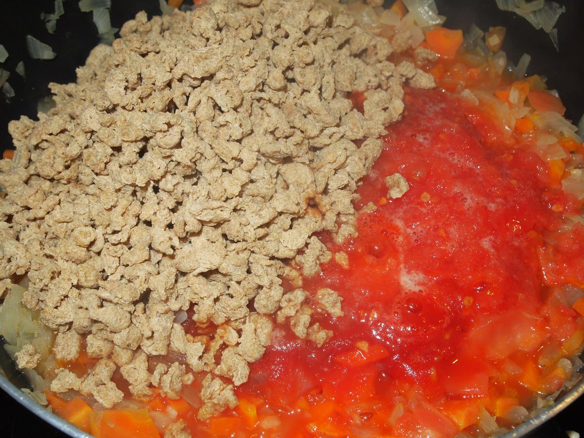 Añadimos los tomates rallados y la soja, salpimentamos al gusto y dejamos que se cocine a fuego suave removiendo de vez en cuando unos 30 minutos.