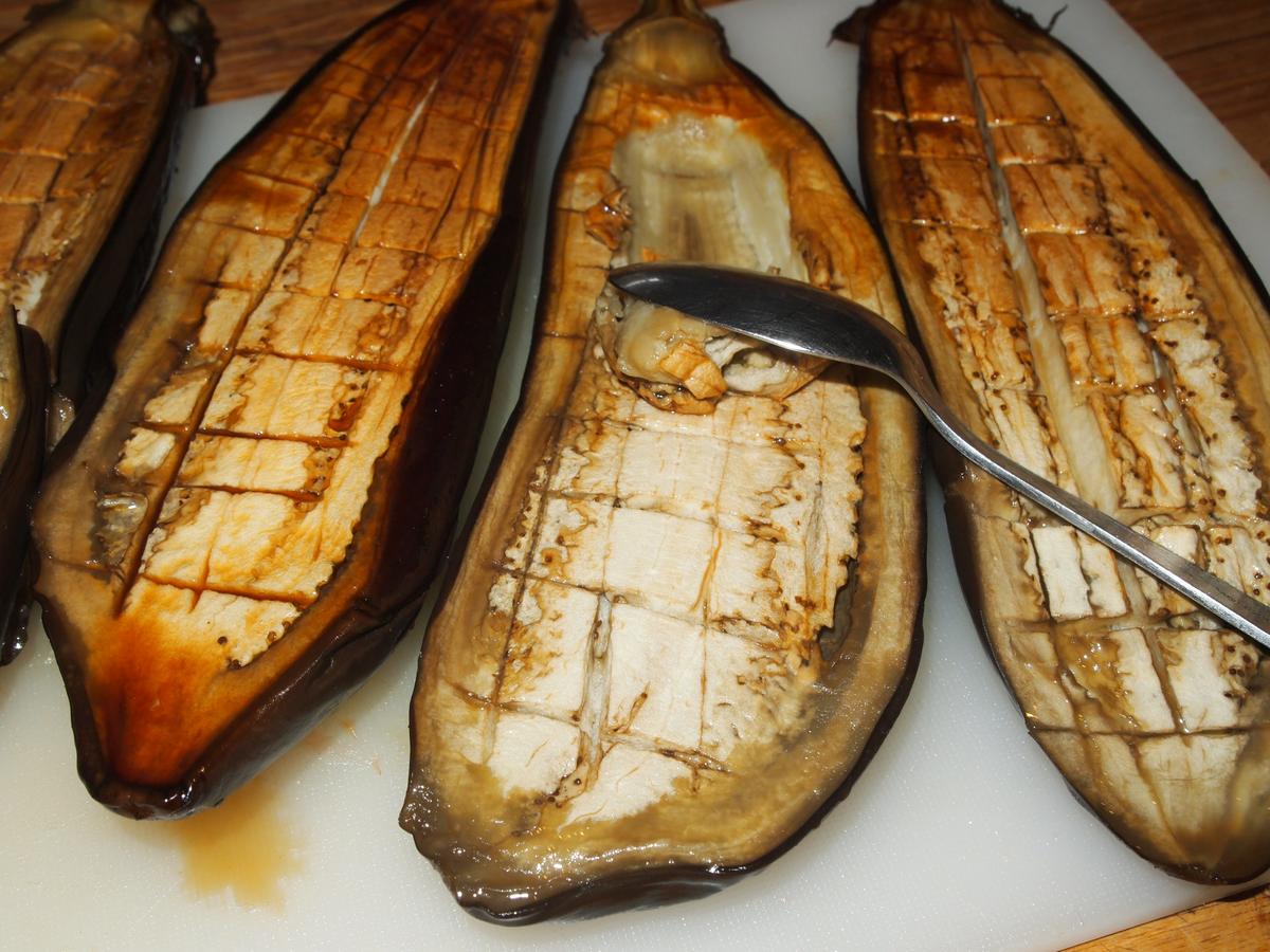 Sacar las berenjenas del horno, con ayuda de una cuchara y sin quemarnos, sacar la carne de las berenjenas, picar y agregar a nuestra salsa boloñesa.