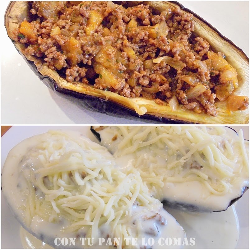 8. Rellenamos las berenjenas con la mezcla de la carne, cubrimos con la bechamel y ponemos el queso rallado para gratinarlas.