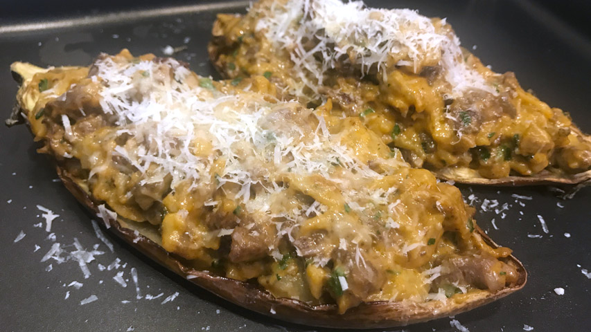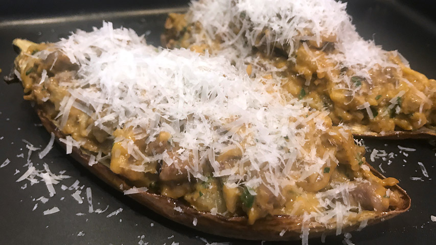 Rellena la piel de las berenjenas con el contenido de la sartén.