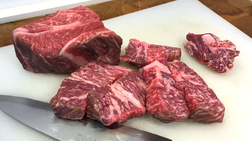 Corto la carne en trocitos pequeños retirando las trencillas, grasa excesiva, etc. Prefiero el relleno de la berenjena cortado en trocitos que picada (molida).