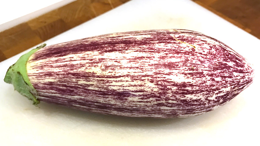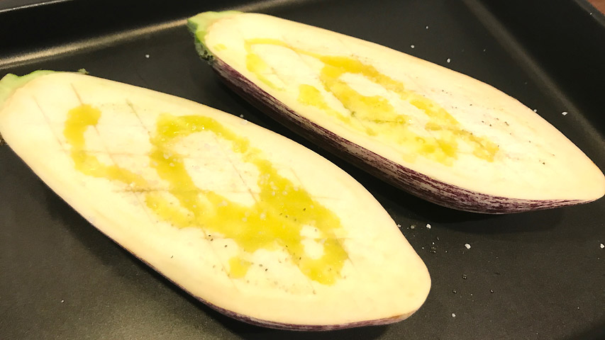 Corta las berenjenas a lo largo y practica unos cortes en forma de rejilla sin llegar a traspasar la piel de la berenjena.
