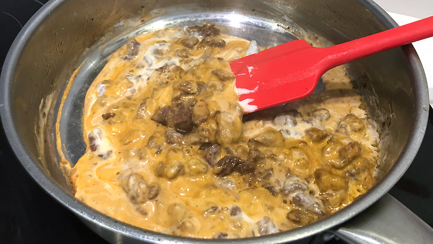 Con el brandy se suelta todo lo que pudiera haberse podido quedar "agarrado" al fondo de la sartén.