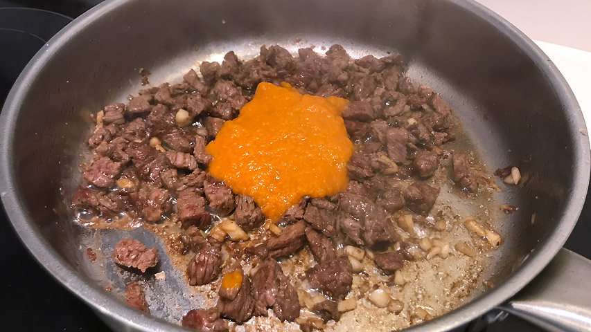 Pica bien la pulpa con el cuchillo e incorpórala a la sartén del relleno.