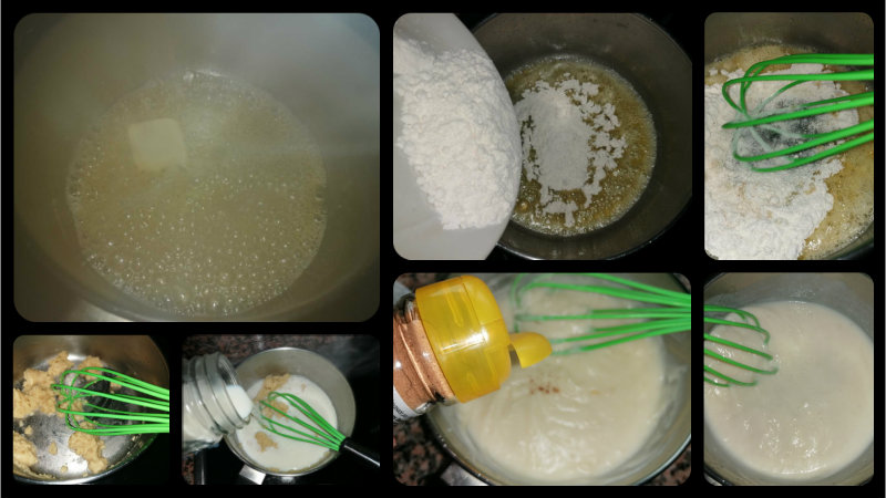 En un recipiente ponemos con 50 g de mantequilla, una vez desecha añadimos como 3 cucharadas de harina, dejamos hacerse sin dejar de remover, después añadir leche (la que se necesite) y no dejar de remover a fuego suave para que no queden grumos, por último añadir la nuez moscada y el sal, la bechamel ha de quedar suelta, más líquida que para las croquetas