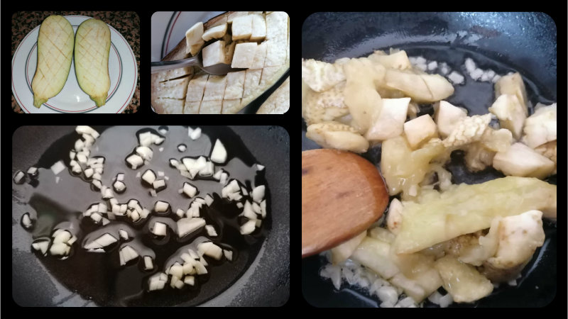 Luego sacamos el relleno, ponemos a freír un ajo en un poco de aceite y a continuación añadimos la berenjena, rehogamos todo junto unos minutos