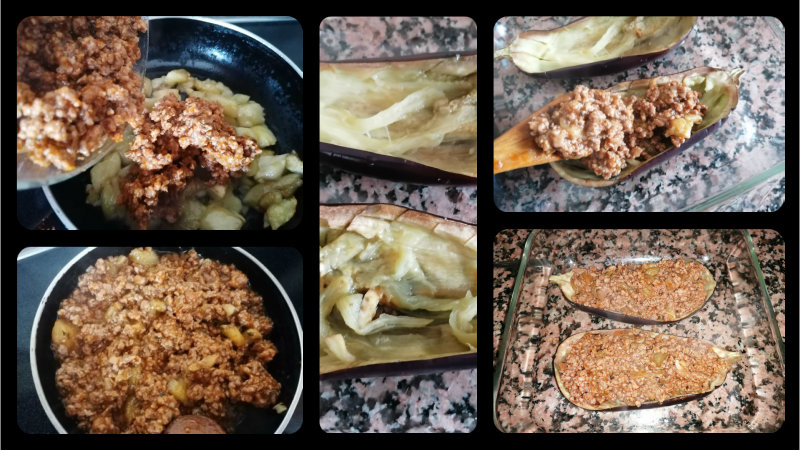 Una vez hecho añadimos la carne mezclada y dejamos hacerse junto 2 minutos, luego ya solo queda rellenar bien las berenejenas.