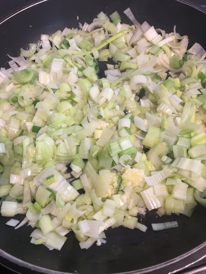Mientras tanto, se van picando el puerro y la media cebolla o cebolleta. Se pone aceite en la sartén, se sube a fuego medio y se añade el puerro y la cebolla picados. Se deja que ablanden las verduras junto con el diente de ajo y la sal.