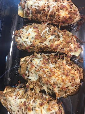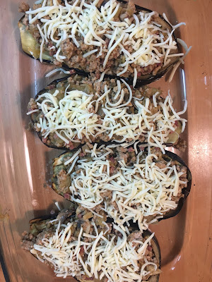 Se deja que se cocine un poco más, e incluso, si queréis se añaden un par de cucharadas de salsa de tomate para que esté más jugoso el relleno. Se van rellenando las mitades de berenjena con la mezcla, se disponen en la fuente de horno, se añade un poco de queso rallado (o de pan rallado si las queremos más ligeras):