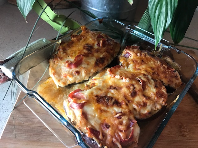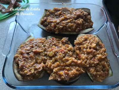 En una fuente de horno ponemos las cascaras de las berenjenas hacia arriba y las rellenamos de la mezcla anterior.