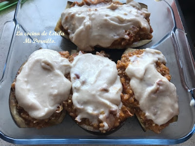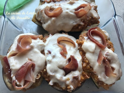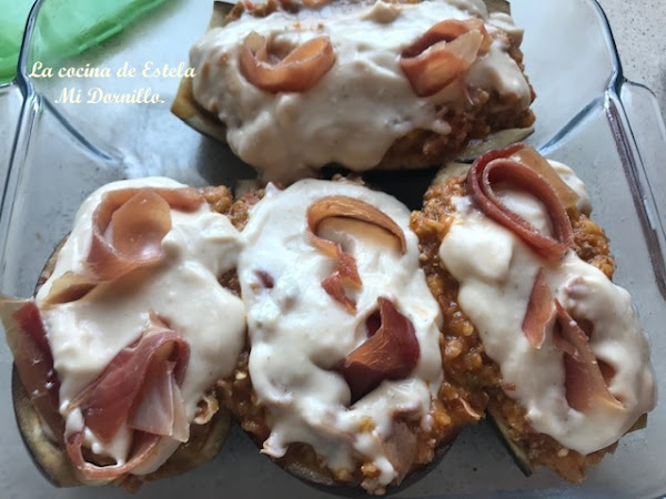 En una fuente de horno ponemos las cascaras de las berenjenas hacia arriba y las rellenamos de la mezcla anterior. Ponemos encima una cucharada grande de bechamel que cubra y el jamón serrano reservado cortado en tiras.