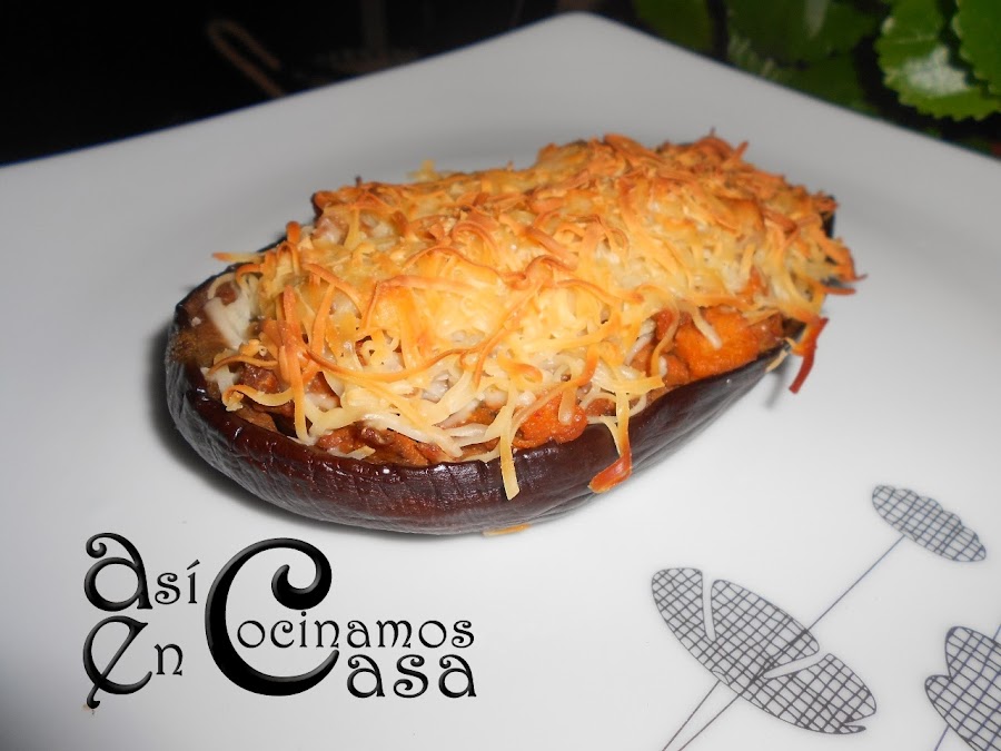 Lo primero es preparar las berenjenas. Las abrimos a lo largo en 2. Para hacerlas hay 2 opciones, 3, de hecho. Yo las hago al horno hasta que están blanditas, pero podemos ponerlas unos minutitos en el microondas (más rápido) o como me ha dicho mi suegra, hervidas en agua (esto no lo he probado, pero me dice que sale más jugosa). El caso es que cuando están hechas las sacamos y con cuidado extraemos toda la pulpa, que juntaremos después con el resto de ingredientes. Las barquitas que hemos hecho con la piel las reservamos.