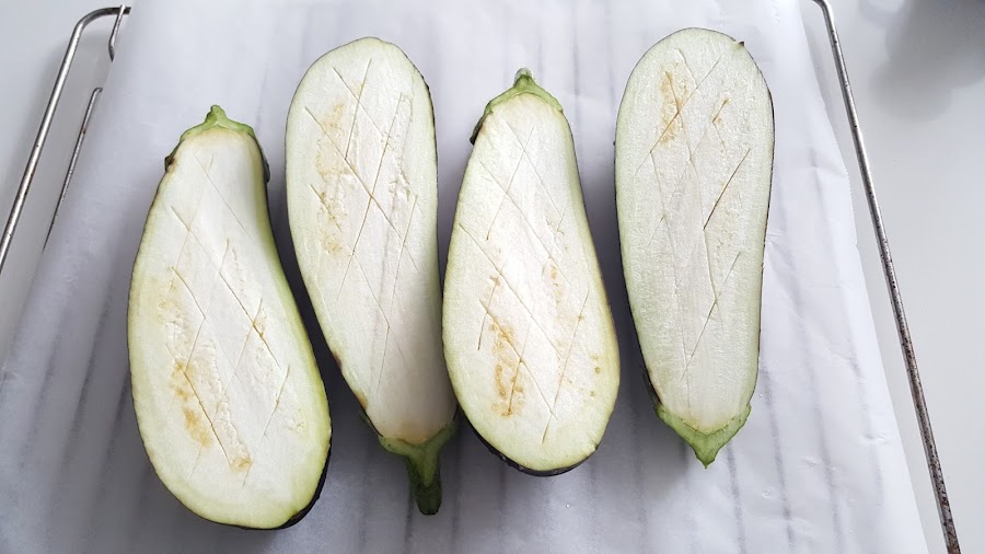 1. - Precalentamos el horno a 180º . Enjuagamos bien las berenjenas y las cortamos por la mitad a lo largo, haciendo unos cortes por el centro. Y metemos 40 minutos al horno.