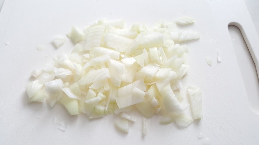 2. - Mientras se cocinan, pelamos, troceamos la cebolla y ponemos en una sartén a fuego medio.