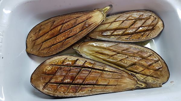 1.- Partimos las berenjenas por la mitad, le hacemos unos portes en la pulpa y las dejamos en remojo con agua y sal 30 minutos. Pasado ese tiempo las escurrimos bien. Rociamos las berenjenas con un poco de sal por encima y las asamos 30 o 35 minutos con el horno precalentado a 180º. Dejamos que se templen las berenjenas y con la ayuda de una cuchara le quitamos la pulpa, sin romper las berenjenas.