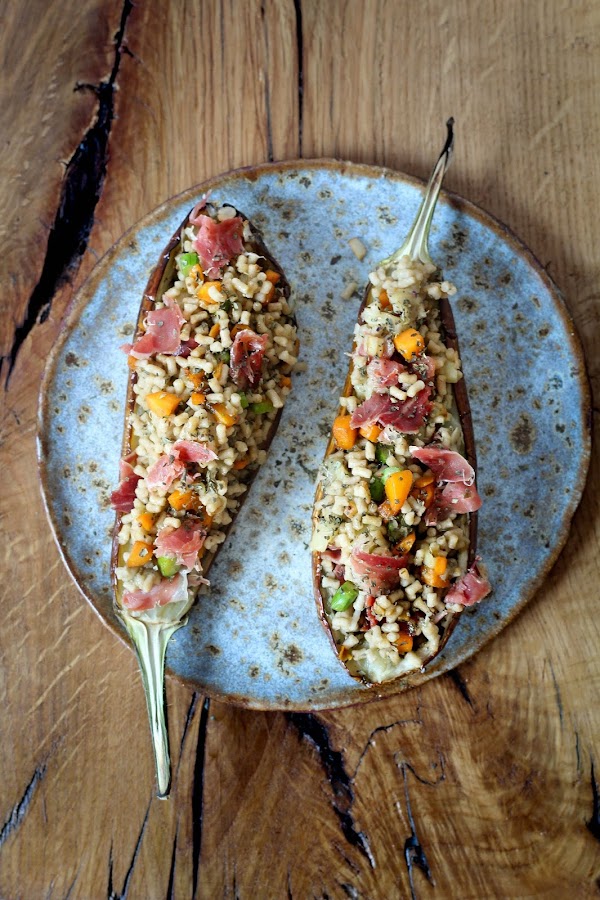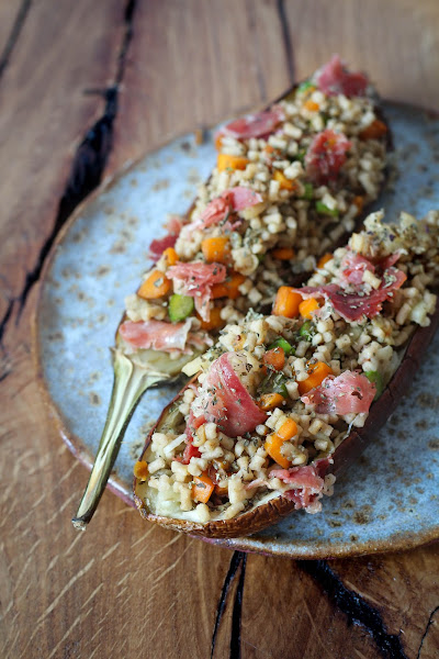 He preparado unas berenjenas rellenas de cuscús con verduras y jamón ibérico y ha quedado muy rico.