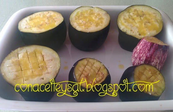 Una vez tenemos nuestras berenjenas cortadas le practicamos unos cortes superficiales por la cara de arriba y le añadimos un poco de aceite de oliva por encima y al horno que ya tenemos precalentado a 180 º durante 15 min.