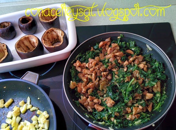 Como ya habrán pasado los 15 minutos de las berenjenas en el horno es el momento de retirarlas y sacar el interior de las mismas. (OJO QUE QUEMAN) así que para evitar males mayores os ayudáis de un trapo de cocina y con un cuchillo se vacía el interior de las berenjenas quedando estas con forma hueca y cilíndrica en su interior.