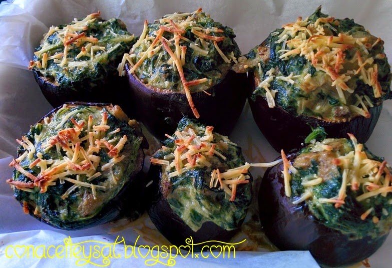 Antes de eso ponemos en la fuente del horno un papel vegetal para evitar tener problemas posteriores en el horno, Ahora vamos a proceder a rellenar las berenjenas con nuestras espinacas a la crema y de nuevo al horno a 180 º durante 13 minutos ,pasados estos 13 minutos añadimos un poco de queso para fundir y 5 minutos al Grill .