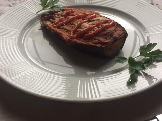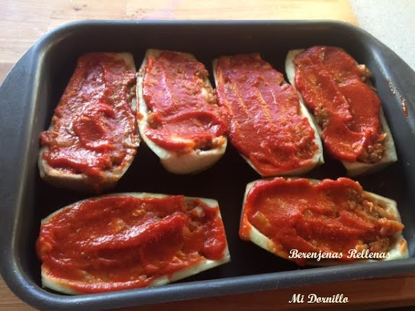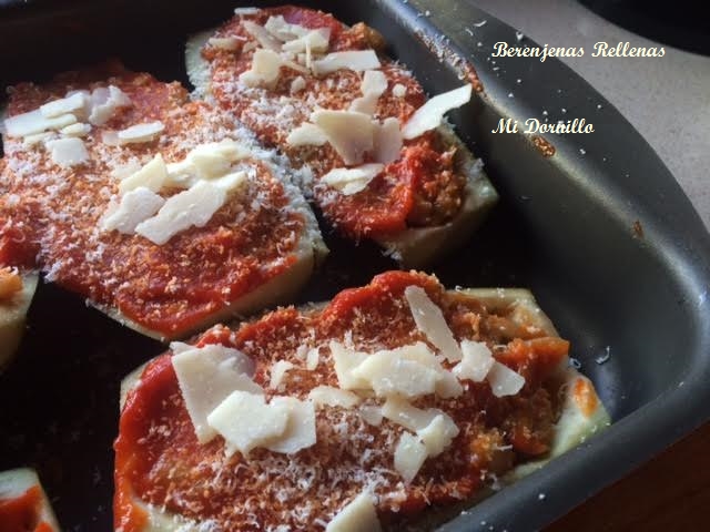 Rellenamos las mitades de berenjenas y cubrimos con tomate frito y queso mozarela, rociándolo con un poco de Parmesano.