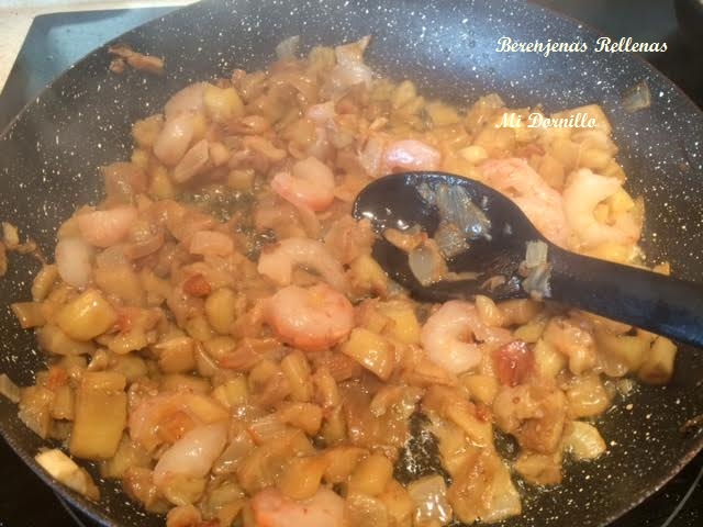 Cortamos por la mitad las berenjenas y las ponemos en agua con sal.Dejamos un rato.