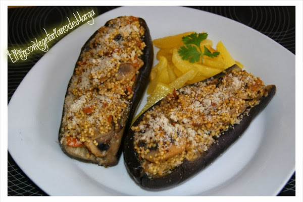 Mezclamos el mijo con la pulpa de las berenjenas y dos cucharadas de nata (crema de leche) de almendra. Rellenamos las berenjenas, espolvoreamos almendra molida por encima y las horneamos unos minutos, mientras freímos las patatas fritas.