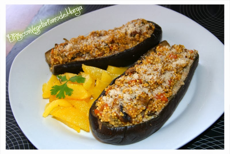 Hoy he preparado unas berenjenas muy otoñales, rellenas de mijo con setas y calabaza.