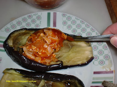 lavamos y cortamos por la mitad la berenjena hacemos unos cortes para poder sacar la carne luego