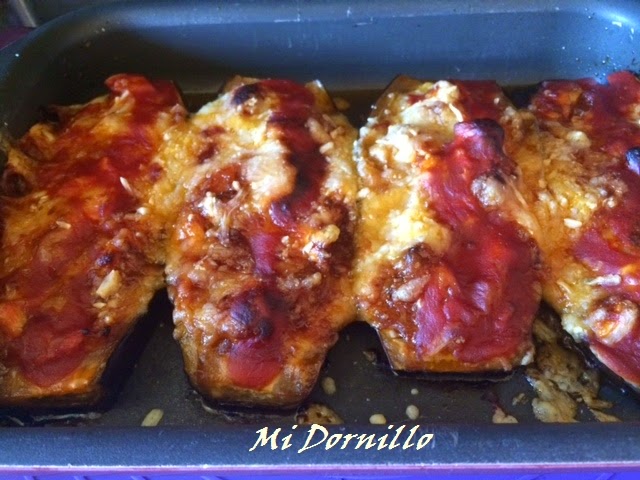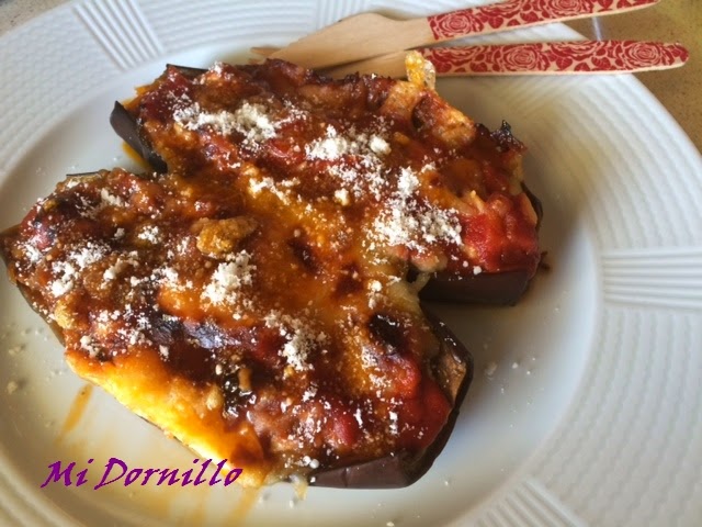 He escogido unas berenjenas rellenas de Pollo, nunca las había rellenado antes con pollo, si con carne picada. Y la verdad que están muy ricas. Yo tengo que decir que no hago previamente las berenjenas, ni trituro la mezcla, así nos vamos encontrando los trocitos pequeños de pollo. Pienso que quedan muy ricas sin tenerlas que hacer en el horno previamente como nos dice nuestra anfitriona.