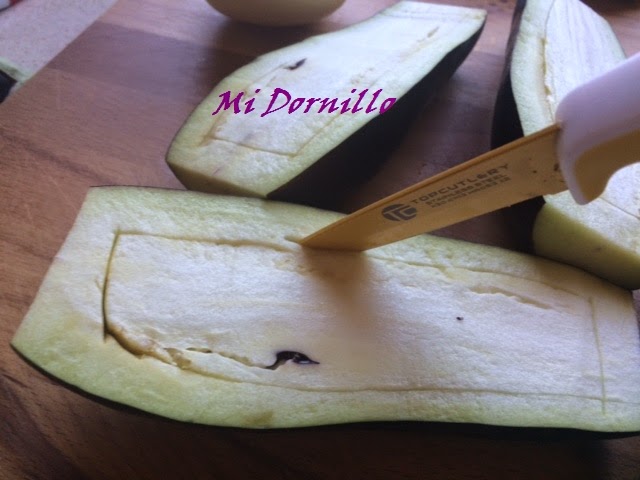 Las berenjenas las lavamos y cortamos por medio, ayudándonos de la punta de un cuchillo, marcamos para vaciar y después con una cucharita con mucho cuidado vamos vaciando la carne sin que se nos rompa la cascara.Las cascaras las ponemos en agua con sal.