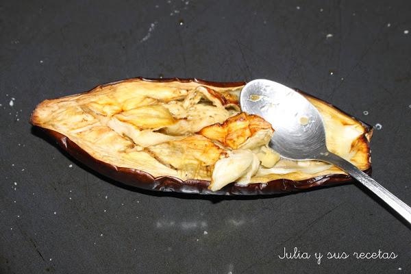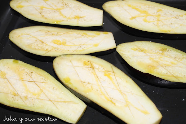 Les quitamos el rabito a las berenjena y las partimos por la mitad. Les hacemos unos corten en la carne sin profundizar demasiado y las ponemos en la bandeja de horno con sal y un chorrito de aceite crudo por encima.