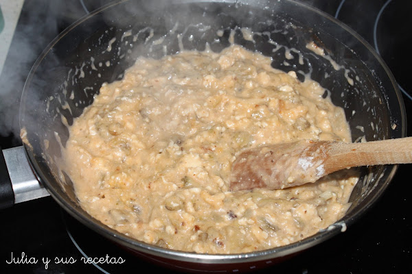 La mezclamos y añadimos la cucharada de harina, removemos y vamos echando la leche poco a poco hasta que se forme una bechamel, ni espesa, ni demasiado clarita.