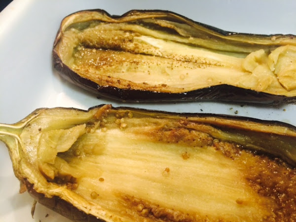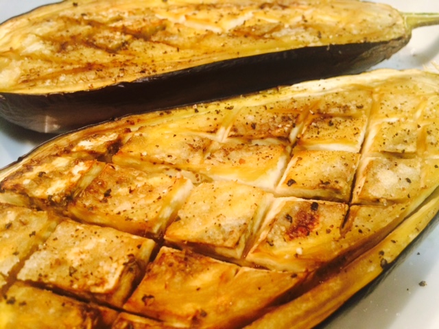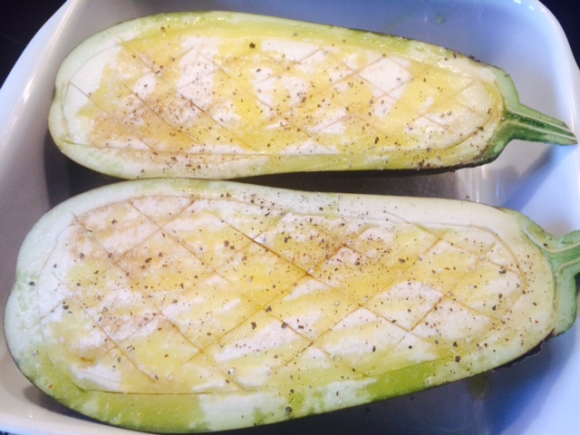 Después, hacemos unos cortes como en la foto por el centro de la berenjena. Salpimetamos, un chorrito de aceite y al horno durante unos 30 min aproximadamente.
