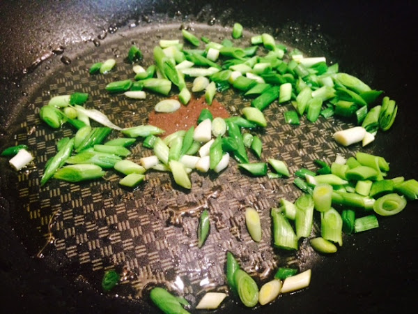 Después en la misma sartén echar un par de cucharadas de aceite y añadir los ajos tiernos y cortados en rodajas pochándolos a fuego medio durante unos 10-15 minutos.