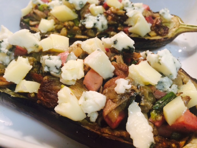 Ahora rellenar con esta mezcla las berenjenas. A mi me gusta hacer un poco de "montaña" con el relleno y finalmente acabar con una loncha del queso que más os guste o unos tacos del mismo queso y espolvorear un poquito de orégano.
