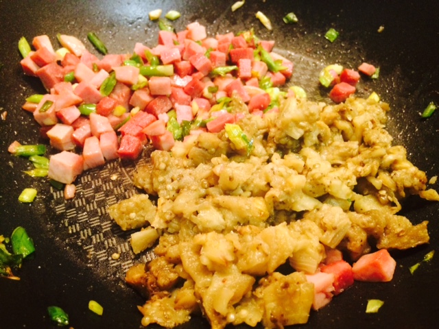 Sacar las berenjenas del horno (no apagues el horno que te va a volver a hacer falta enseguida) y con cuidado de no romperlas, ni de quemarse, quitar la carne de la berenjena con una cucharita, picar un poco la carne de la berenjena y echarla a la sartén donde tenemos los ajos tiernos y el jamón.